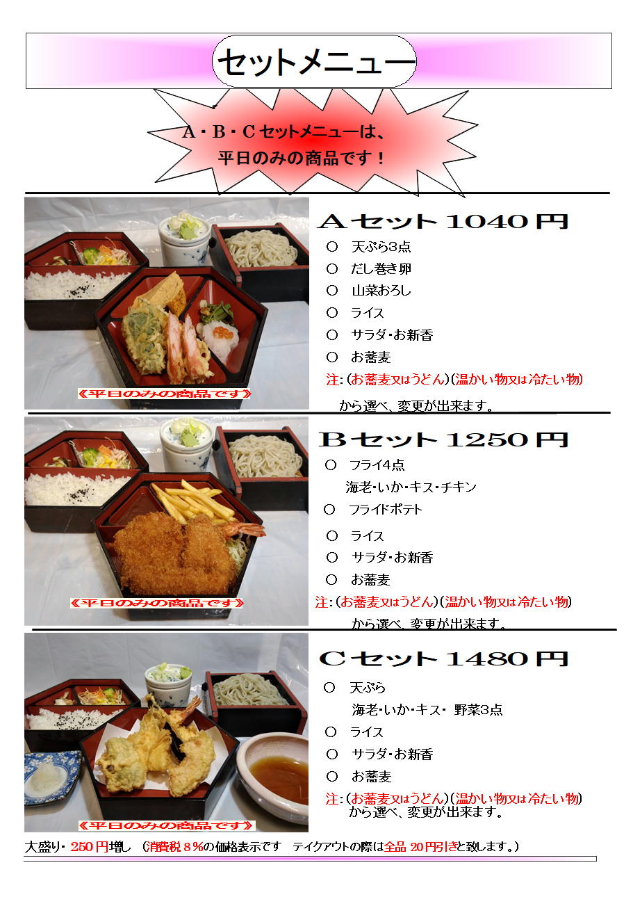 掲載されているのは出前時のメニューとなります。表記は8%となっておりますが、店内で食事されたときと値段は変わりません。*価格変更のお知らせ*2026/04/01より価格が変更となります。まだまだ様々な物の値上がりが続いております。お客様にはご負担をお掛けしますが、ご了承下さい。